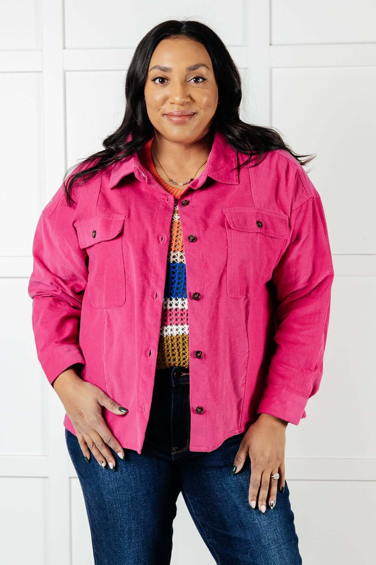 Our Perfect Pop of Pink Jacket is the ideal way to update your look. Great for layering, this lightweight corduroy jacket features patch pockets, a button front, and a boyfriend fit so you'll look stylish and feel comfortable all season long.